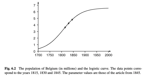 Verhulst says that you can figure out this logistic curve with as little as three measurements. So for example, given the estimates of the population of Belgium in 1815, 1830, and 1845, (respectively 3.627, 4.247 and 4.801 million) he predicts a population of 4.998 million in 1851.