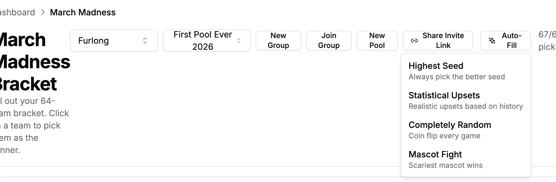 When filling out a bracket, I thought it would be convenient to have an autofill feature. This gives users the option to fill in with 4 potential strategies.